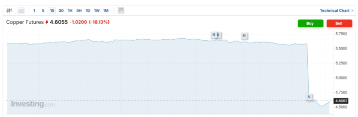 当天,在白宫宣布这一关税后,纽约铜价一度暴跌逾18%,至每磅4.60美元。北美最大铜生产商自由港麦克莫兰(Freeport-McMoRan)和南方铜业(SouthernCopper)分别下跌约10%和6%以上。