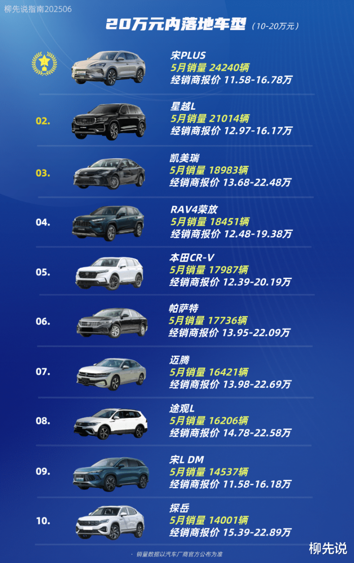 榜单1-5名:宋PLUS、星越L、凯美瑞、RAV4荣放和本田CR-V。其中,宋PLUS和星越L的月销量均突破2万辆,展现出强劲的市场号召力。特别是比亚迪宋PLUS,在今年5月的销量达到了24240辆,稳居榜首。宋PLUS的成功主要得益于其均衡的产品力,无论是纯电版还是DM-i混动版本,都具备较低的使用成本和较高的续航能力,符合当前消费者对新能源SUV的需求。