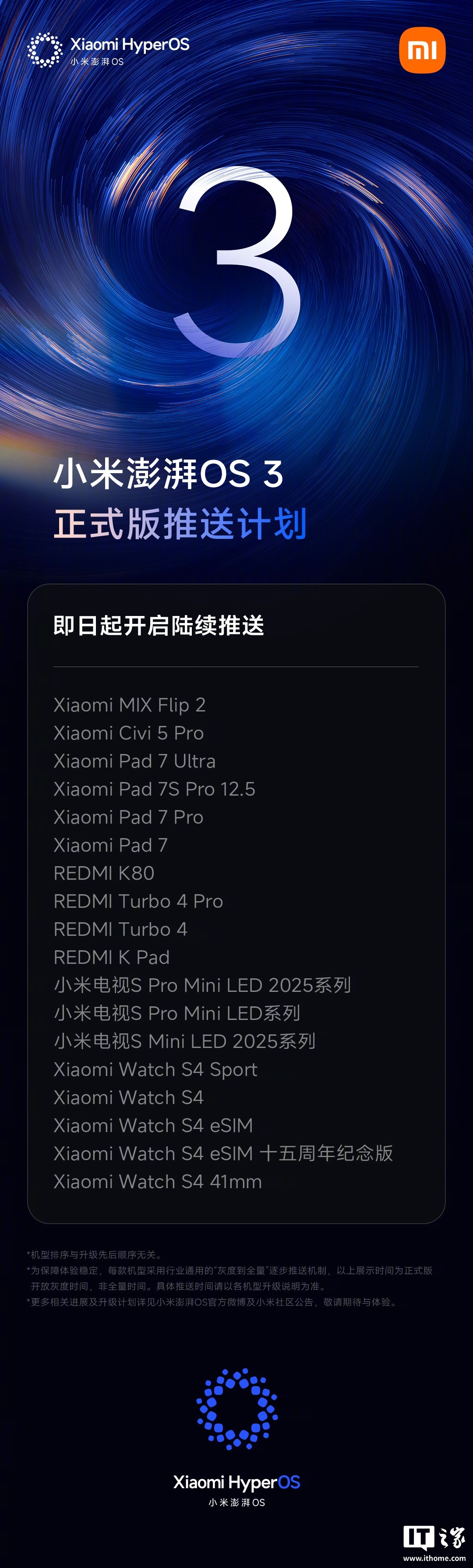 目前,小米澎湃 OS 3 正式版已覆盖更多机型,本次升级覆盖机型从 10 月 28 日起开始陆续推送,含 MIX Flip 2 等。