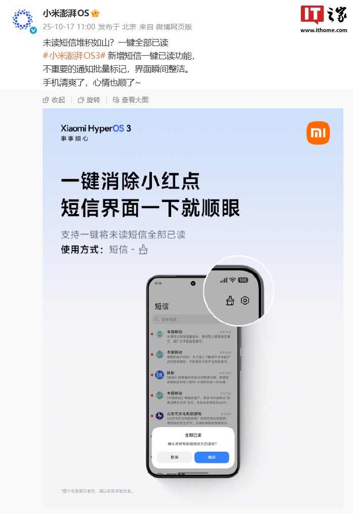 IT之家注意到,小米澎湃 OS 官方微博曾宣布在 OS 3 系统中推出“短信一键已读”功能,不重要的通知可批量标记,界面瞬间整洁。