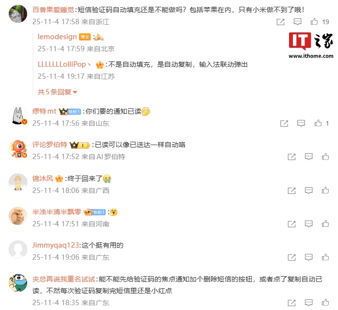 根据评论区用户讨论来看,小米澎湃 OS / MIUI 系统原本支持短信通知横幅内「已读」按钮功能,但在后续更新中被去除。另有用户反馈,希望支持短信验证码自动填充功能,小米工作人员 @lemodesign 回复了一个“[抱拳]”表情,预计是接收到该反馈,后续将更新支持。